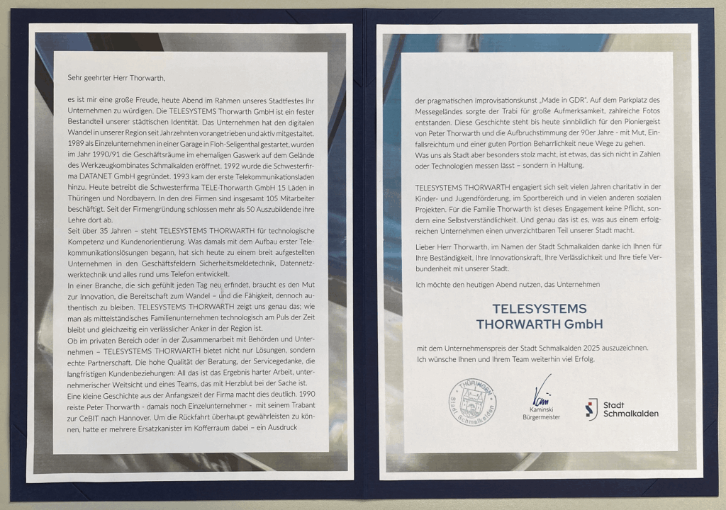Nach der Wende erfolgte die Umfirmierung in „Telefonbau THORWARTH“, nach Erweiterung des Portfolio und weiteren Wachstum im Jahr 2000 in TELESYSTEMS THORWARTH GmbH“. (siehe auch …)